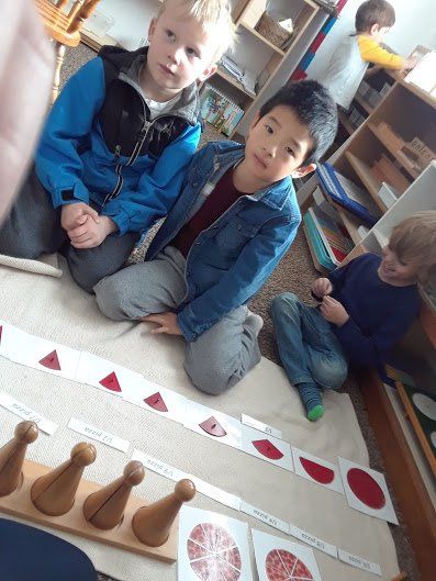 The process is taught first, and the facts later. Our program is set up to help develop a sense of order, coordination, concentration, and independence. Numbers through ten, decimal system, linear and skip counting, tables of arithmetic, abstract equations, fractions.